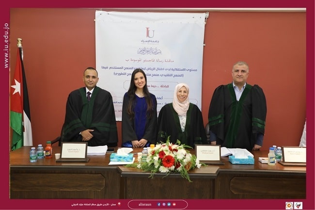 ناقشت الطالبة ديما عصام المومني من كلية العلوم التربوية بجامعة الإسراء رسالة الماجستير الخاصة بها والموسومة ب"مستوى الاستقلالية لدى أطفال الرياض تبعا لنوع المنهج المستخدم فيها (المنهاج التقليدي، منهج منتسوري والمنهاج التطوري)"