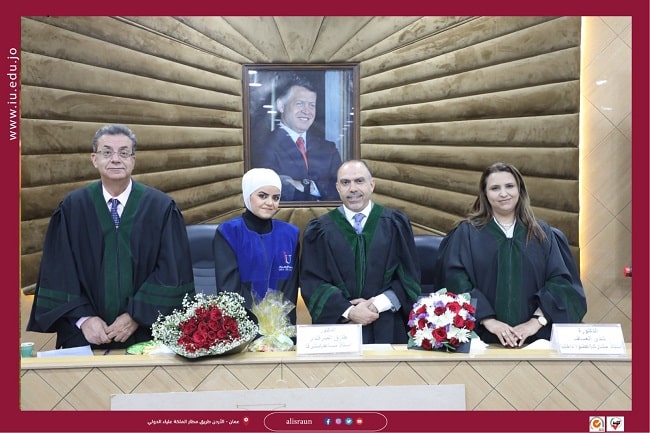 وتكونت لجنة المناقشة من الدكتور طارق علي (مشرفاً ورئيساً) والدكتورة شذى العساف (مناقشاً داخلياً) والأستاذ الدكتور عمر الاعمر (مناقشاً خارجياً من جامعة البترا).