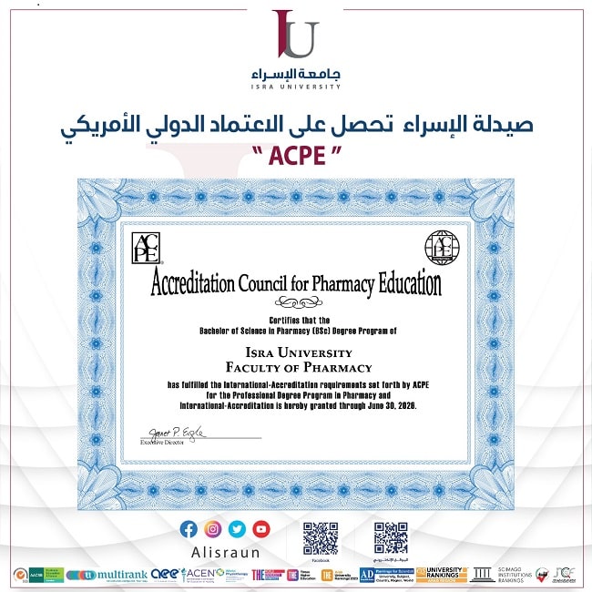 صيدلة جامعة الإسراء تحصل على شهادة الاعتماد الدولي الأمريكي ACPE