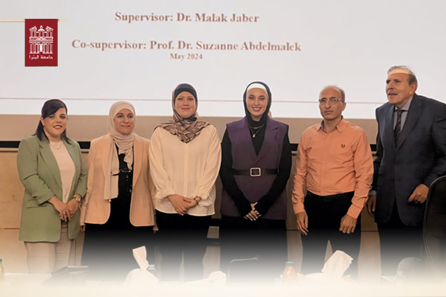 وتكونت لجنة المناقشة من الدكتوره ملاك جابر كمشرفة رئيسية و أ.د. سوزان عبد المالك كمشرفة مشاركة و أ.د. سهير سنقرط ممتحناً خارجياً، و أ.د. ابراهيم الادهم و أ.د. فيصل عكايلة ممتحنان داخليان.