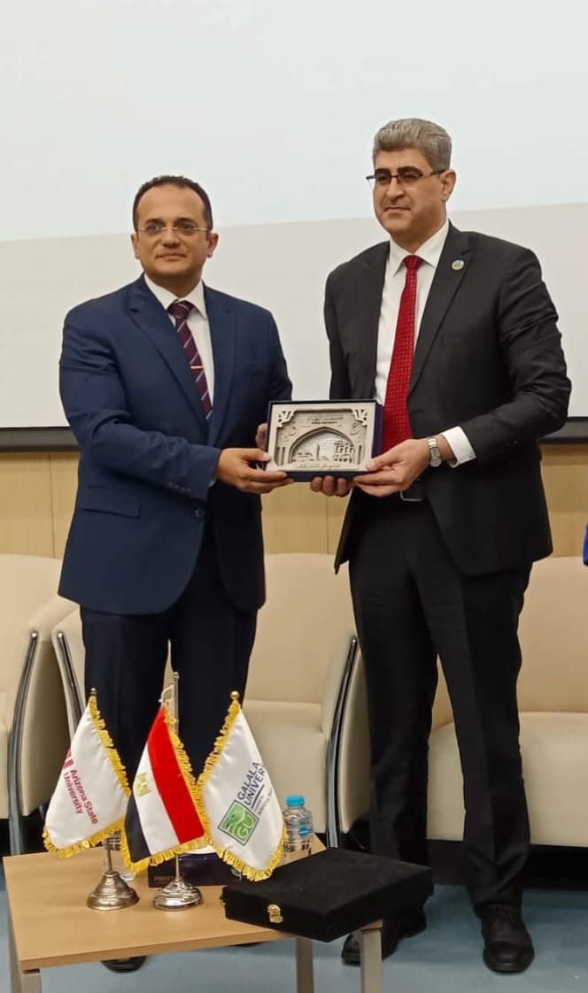 وفي ختام فعاليات المؤتمر، قدم عيشة درع جامعة الزرقاء لرئيس جامعة الجلالة.