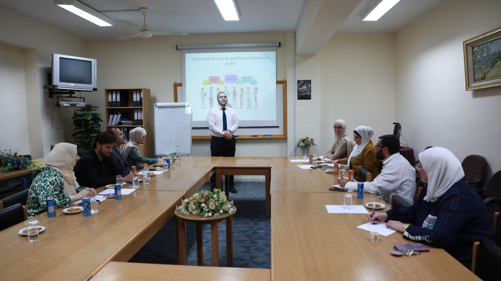 وقدَّم الورشة رئيس قسم تمريض صحة المجتمع والصحة النفسية الدكتور إسلام علي العويدات، حيث شارك فيها العمداء ونواب العمداء ورؤساء الأقسام الأكاديمية في كليَّتي الصيدلة والتمريض. واستعرض الدكتور العويدات تفصيلاً عملياً عن مراحل إدارة الاجتماعات، والمهارات الأساسية الضرورية لقادة الاجتماعات الفعَّالة، إضافة إلى كيفية تطبيق المهارات القيادية والإدارية في كافة الاجتماعات وفِرَق العمل.