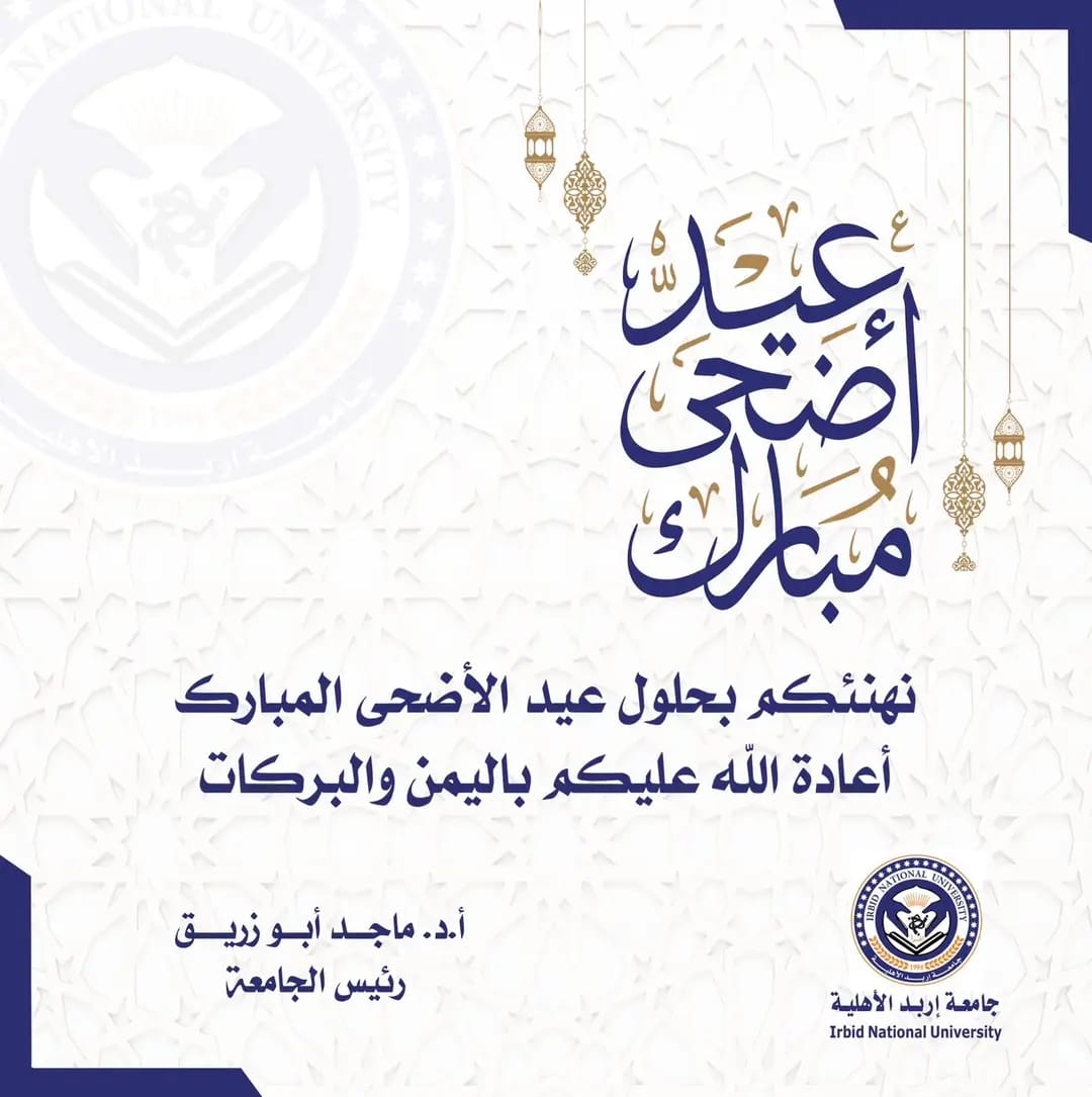 تتقدم جامعة إربد الأهلية، ممثلة بعطوفة الأستاذ الدكتور ماجد أبو زريق رئيس الجامعة، وأسرة الجامعة من أعضاء الهيئتين التدريسية والإدارية، وطلبة الجامعة، إلى حضرة صاحب الجلالة الملك عبدالله الثاني ابن الحسين قائد البلاد، وولي عهده الأمين، وإلى الأسرة الأردنية، والأمة الإسلامية والعربية بأجمل التهنئة والتبريك بمناسبة عيد الأضحى المبارك، سائلين المولى عز وجل أن يعيد هذه المناسبة على الوطن والأمة الإسلامية بوافر من العزة والعافية وهي تنُعم بالأمن والأمان.
