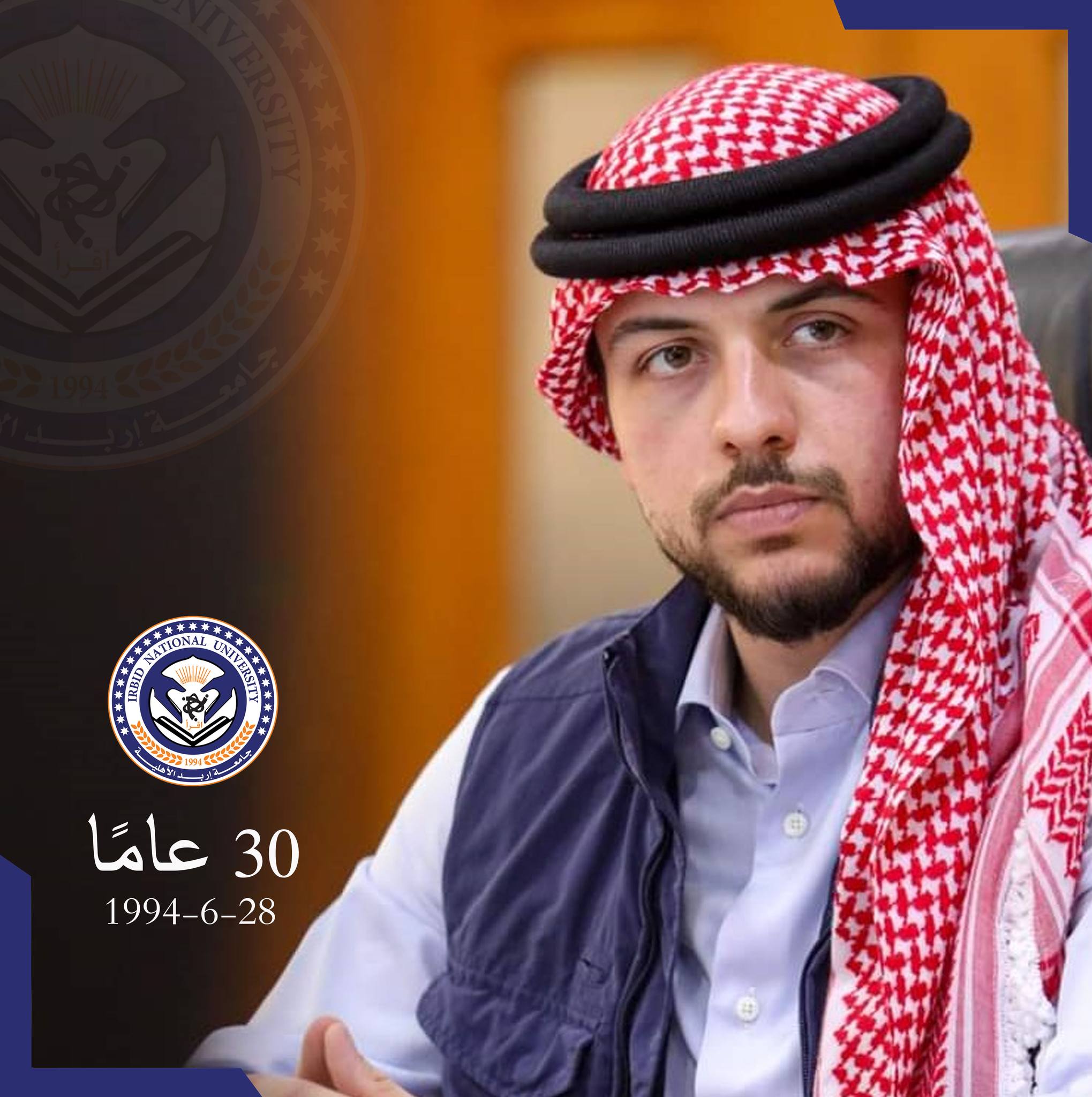 يتقدم الأستاذ الدكتور ماجد أبو زريق رئيس جامعة رئيس جامعة إربد الأهلية، باسمه وباسم أسرة الجامعة، بأسمى آيات التهنئة والتبريك إلى صاحب السمو الملكي الأمير الحسين ابن عبدالله الثاني ولي العهد بمناسبة عيد ميلاده الثلاثون، متمنين لسموه دوام الصحة والعافية ومزيدًا من العطاء في كنف حضرة صاحب الجلالة الهاشمية الملك عبدالله الثاني ابن الحسين المعظم أطال الله في عمره.