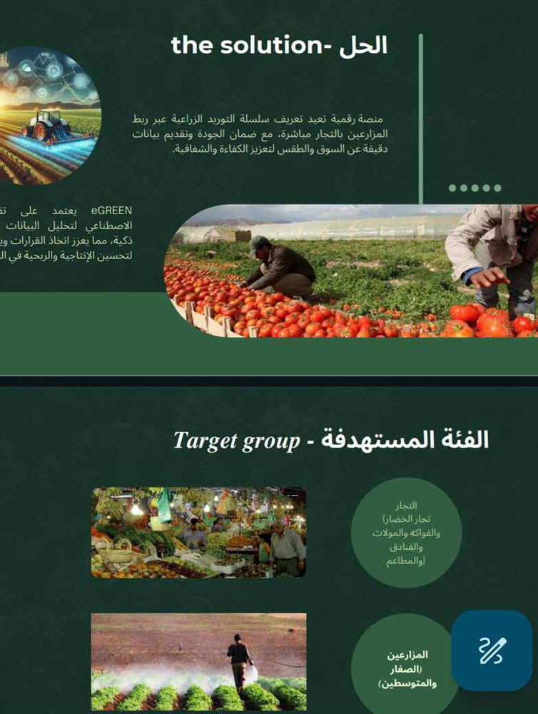 ويهدف المشروع المقدم من طلبة الجامعة إلى إنشاء منصة تعزيز الكفاءة في سلاسل التوريد الزراعية eGreen والتي من شأنها تقليل الوسطاء بين المزارعين والتجار وتحسين سرعة وفعالية عمليات الشراء والبيع وذلك لزيادة الشفافية والتنظيم والكفاءة مما يقلل من هدر الوقت والجهد والموارد وزيادة هامش الربح للعاملين في القطاع الزراعي دون تغيير على أسعار المنتجات الزراعية.