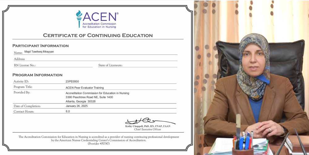 اختيرت الأستاذة الدكتورة مجد توفيق مريان من كلية التمريض في الجامعة الهاشمية، محكّمًا دوليًّا من قبل هيئة الاعتماد الأمريكي لبرامج تعليم التمريض Accreditation Commission for Education in Nursing (ACEN) والتي تعد هيئة عالمية مرموقة في مجال ضمان جودة برامج تعليم التمريض وتقدم اعتماداً متخصصًا لضمان جودة التعليم التمريضي في مختلف المراحل الدارسية من خلال توفير معايير واضحة تساعد على تحسين نوعية التعليم المقدم للطلبة.