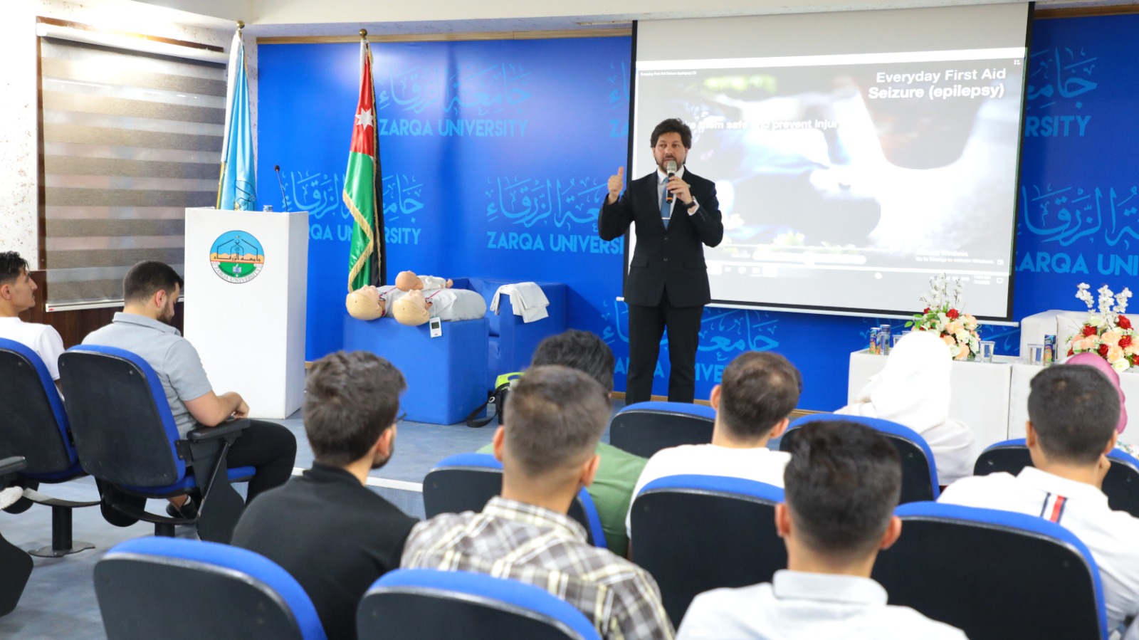 عقدت كلية الصيدلة في جامعة الزرقاء، الثلاثاء 4/7/2023 ورشة تدريبية عن الإسعافات الأولية لطلبة كليتها، قدمها الدكتور مالك الطريفي من كلية التمريض.