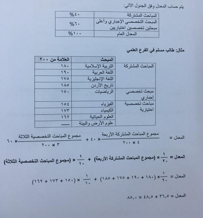 وحول طلبة الفروع المهنية/ مسار كليات المجتمع، أوضحت أن مجموع علامات الطالب في هذه الفروع 1200، بحيث يحسب المعدل المئوي بقسمة المجموع العام الذي حصل عليه الطالب على 12.