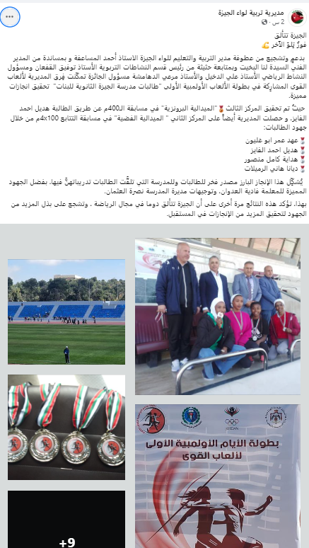 وبحسب ما نشرت المديرية على فيسبوك، حصدت الطالبة هديل احمد الفايز على المركز الثالث "الميدالية البرونزية" في مسابقة الـ400م.
