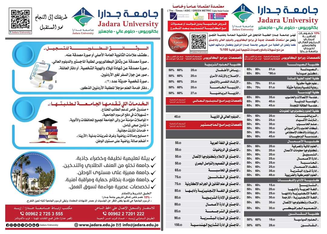 تهنئ #جامعة_جدارا الطلبة الناجحين في #الثانوية_العامة كما تعلن عن فتح باب القبول والتسجيل للفصل الدراسي الأول من العام الجامعي ٢٠٢٣/ ٢٠٢٤م تخصصات نوعية.. خصومات تشجيعية وتسهيلات بالدفع... بيئة جامعية مميزة... بادر بالتسجيل الآن التسجيل مستمر طيلة أيام الأسبوع من السبت إلى الخميس من الساعة ٨:٣٠ صباحًا ولغاية الساعة ٣:٠٠ مساءً في موقع الجامعة_طريق إربد / عمان أو في مكتب ارتباط #جامعة_جدارا (قصر جدارا) اربد / مقابل البوابة الشمالية لجامعة_اليرموك جامعة جدارا.. للتميز عنوان....طريقك إلى النجاح نحو المستقبل....